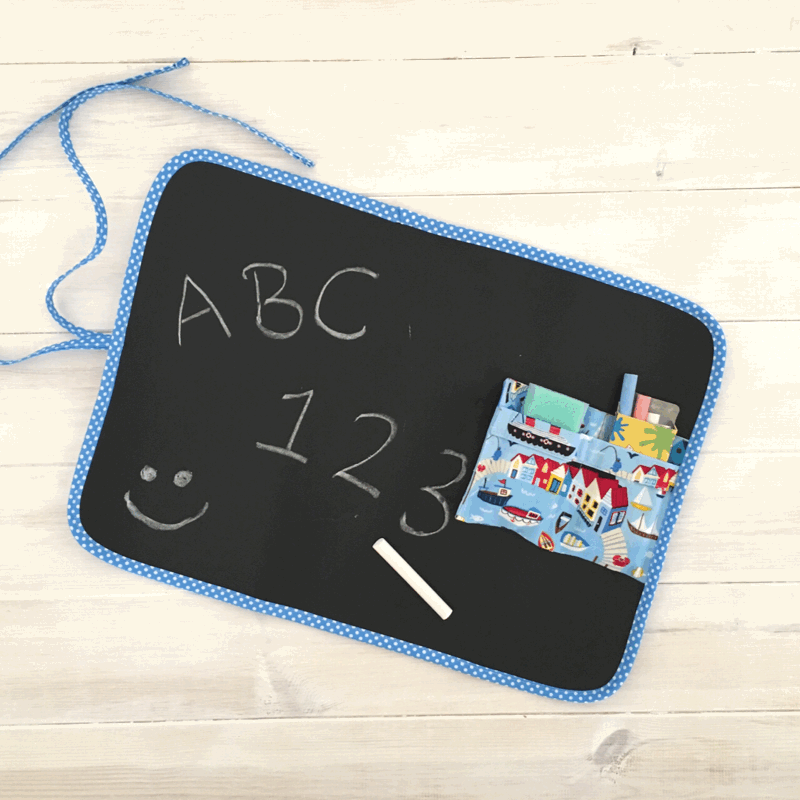 Today I’m sharing how to make a really fun chalkboard roll-up mat. This mat is great to take with you when you are out and about with your kids and find you need an activity to entertain or distract them with, for example at a cafe or restaurant. It requires a bit of sewing, but it’s really easy to make, so let’s get started!