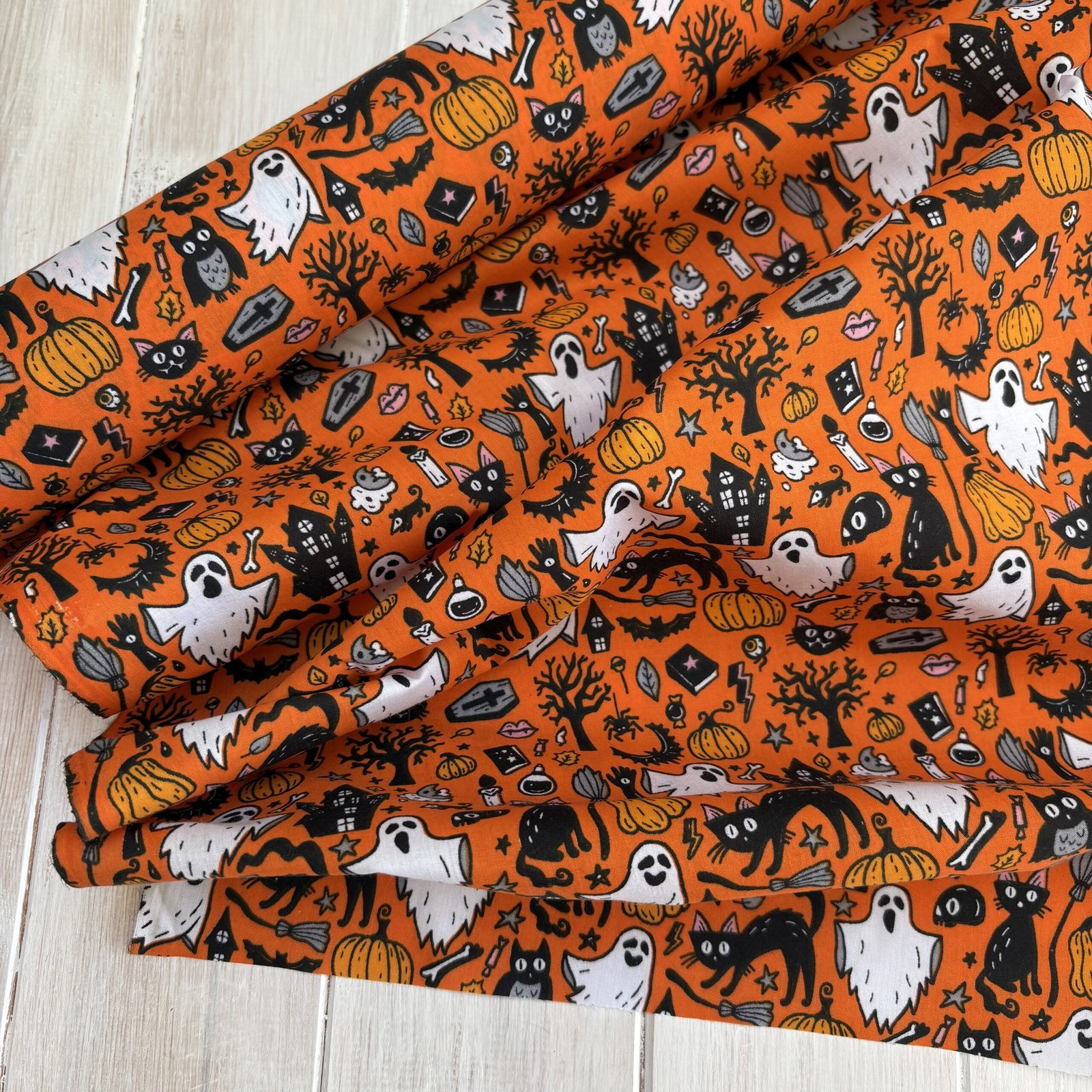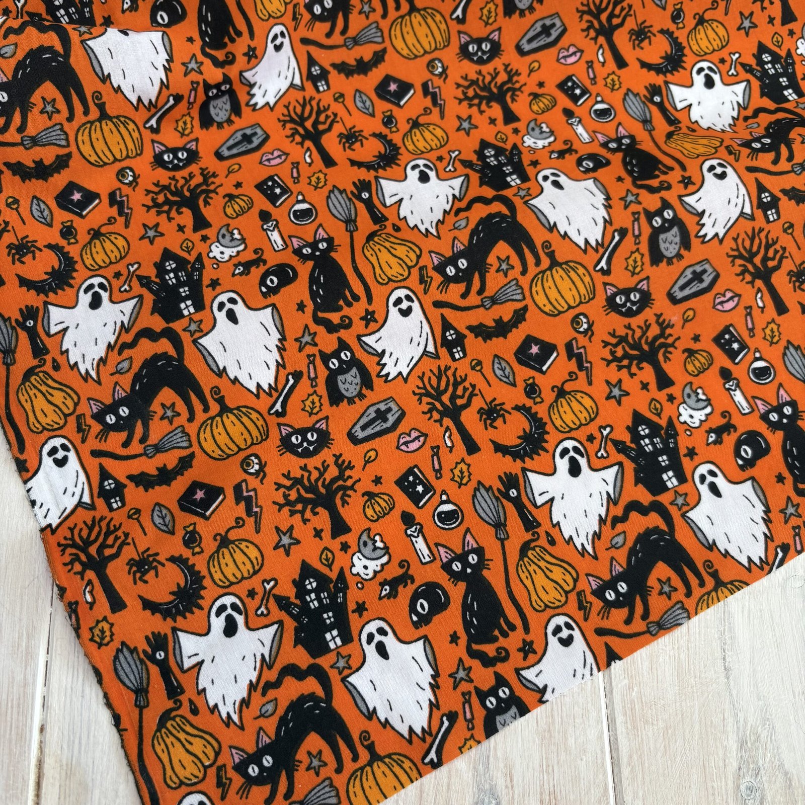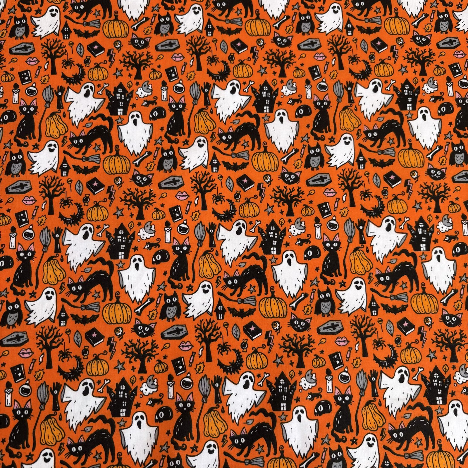 Fabulous fabric for Halloween – Spooky ghosts, black cats, witches brooms, pumpkins, haunted houses and much more all crammed onto this fun fabric.