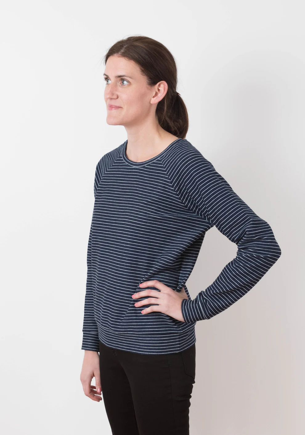 Medium weight knits with a minimum of 20% stretch such as French terry, sweatshirt fleece, sweater knits, and jersey. Extra fabric may be needed to match plaids, stripes, and directional prints.