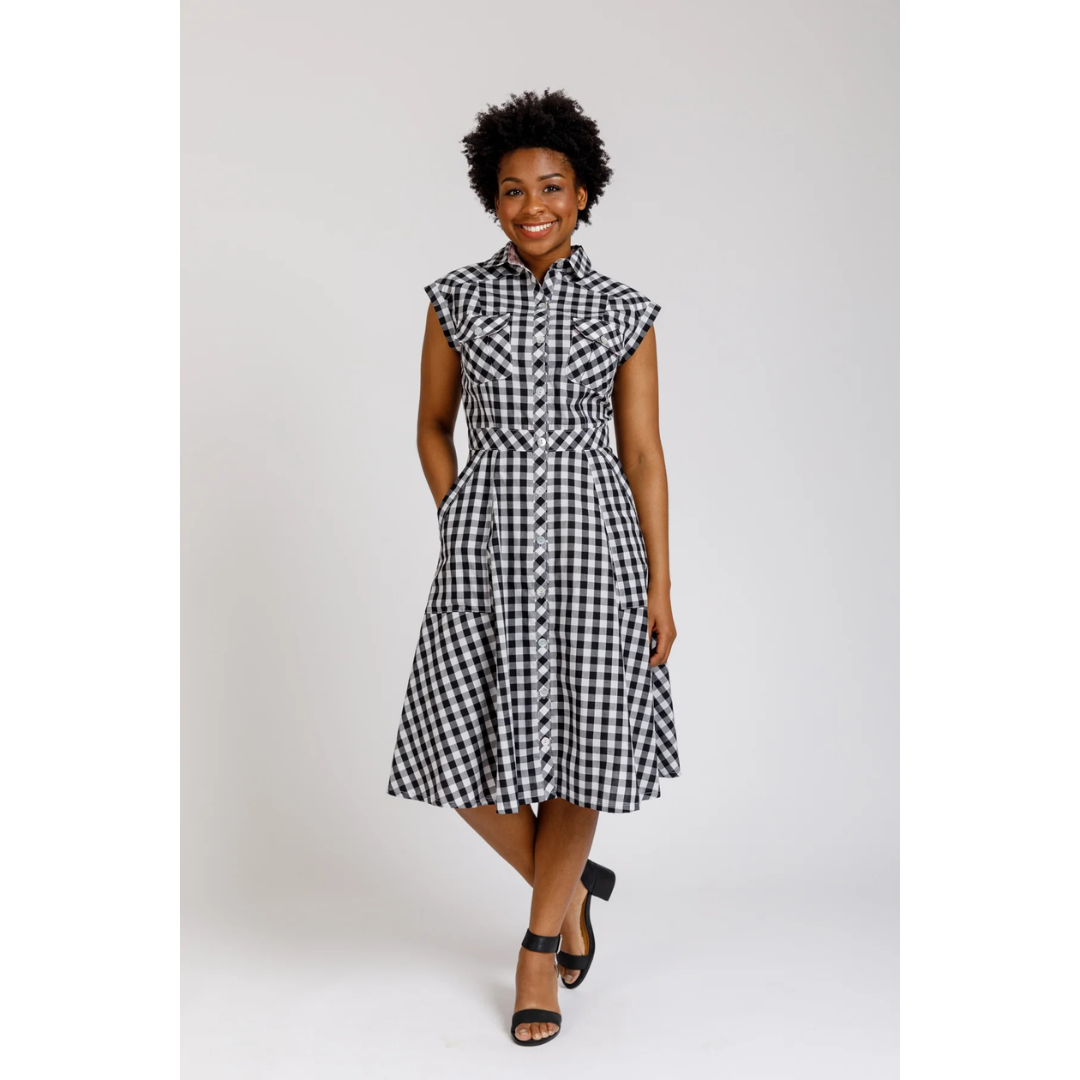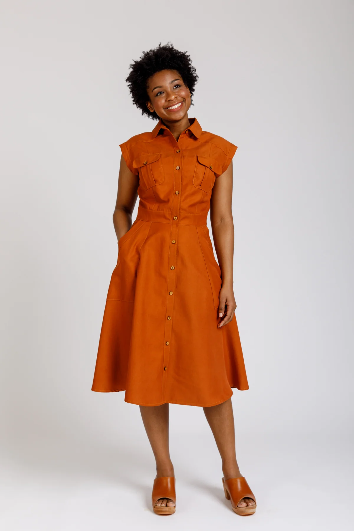 Matilda is a modern utility style shirt dress. Pattern features princess seams, drop shoulder or sleeves, pleated breast pockets, an A-line skirt with roomy statement pockets and collar and stand.