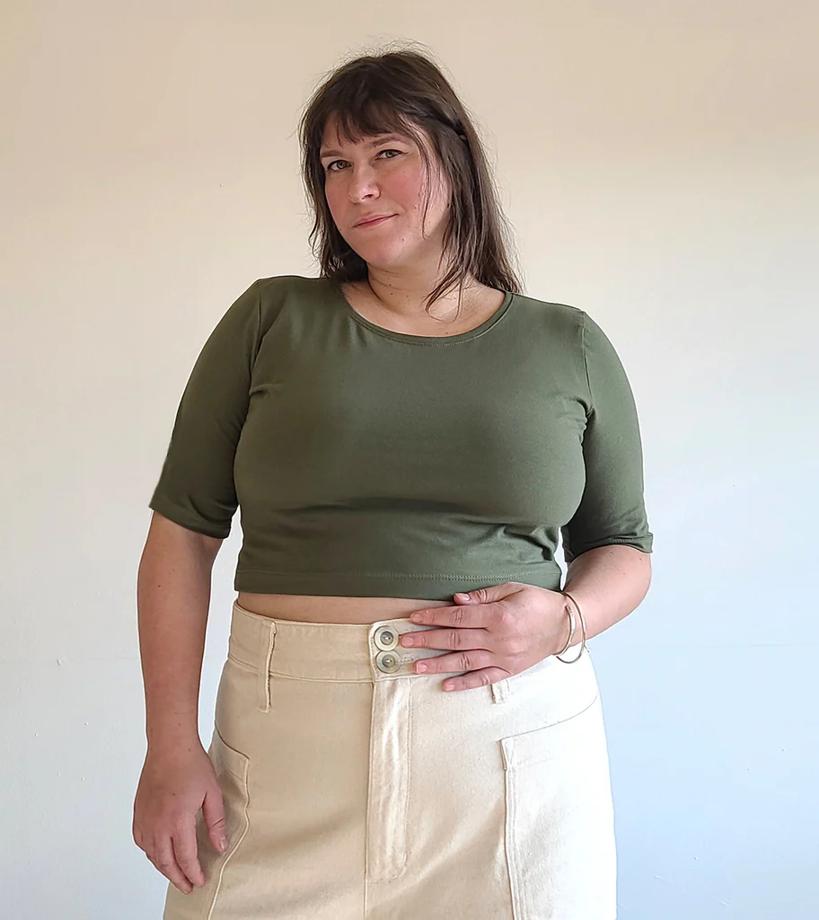 Fabrics: This pattern is designed for light to medium weight 4-way stretch knit fabrics with at least 50% horizontal and vertical stretch such as cotton stretch jersey, bamboo stretch jersey, stretch baby French terry, stretch thermal knit, stretch rib knit, stretch pointelle knit. Good stretch recovery is advised so that neckbands don’t stretch out, however, too much stretch recovery may result in a tighter fitting t-shirt.