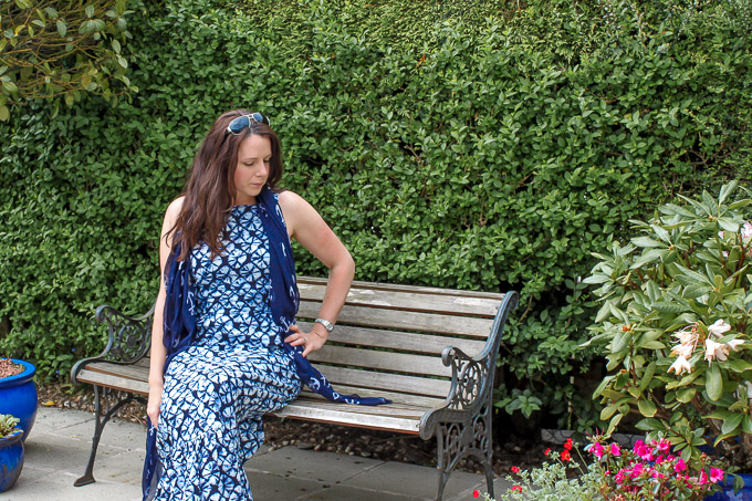 So, what is my overall opinion of the finished dress? Actually, I’m not sure. I’ve included the photo above of me messing around with the scarf as a belt because I think perhaps a belt would divide up the dress nicely and be a little more flattering. Without one I feel it’s a bit too much a sea of blue and actually a bit boring. The dress is really comfy to wear and I love that the fabric doesn’t crease much, or show creases much. However, I feel that I may be chopping into this dress and maybe making the skirt a bit more pencil with a knee-length flounce instead of a maxi – what do you think? As I said, the fabric is quite heavy and I actually got a bit hot wearing it (even though the weather is Spain was abysmal while I was there), so shortening the skirt might help.